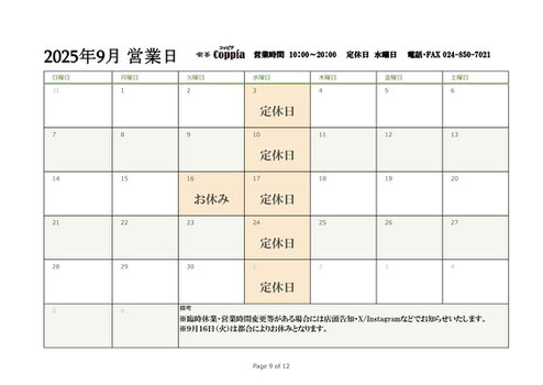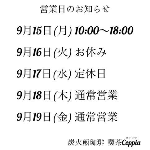 ※変更等があった場合は喫茶CoppiaHP・Twitter・Instagram・Facebook・店頭での掲示でお知らせいたします。